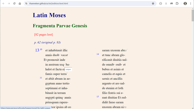 Unsurprisingly, my use case led me to the Text Encoding Initiative (TEI). The advantages of TEI for the production of critical editions has been thoroughly studied. The modules on manuscript description and critical apparatus prompt us to think about our categories and information we should be including. We can describe the text on an abstract level of semantics and defer questions of visualization that may differ from publisher to publisher. LaTeX modules produce beautiful pre-print renditions with apparatus and facing page text and translation. All the desiderata for the hypertext edition can be encoded in the same source and different visualizations can render or ignore as desired.