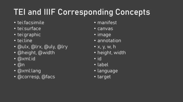 Nicholas Laiacona et al., “Connecting TEI and IIIF.” 2018 IIIF Conference. Washington, DC, 2018. https://iiif.io/event/2018/washington/program/paper-61/.