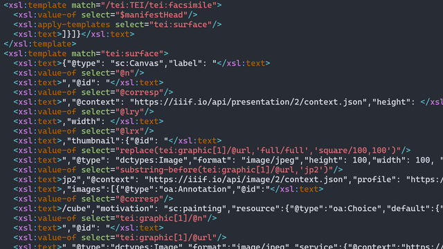So the next question is how to translate the TEI concepts to the IIIF concepts. The main categories are the “homecooked” options and the platforms and virtual research environments I will address following. By “homecooked” I mean relatively short bits of code that a humanist or collaborator might adapt for a specific project, without trying to anticipate every possible use case. I could say more about Python in the discussion if there is interest. Overall, I would say that XSLT is more approachable for my students and the average humanist. It is particularly elegant for rendering HTML, and plain text and JSON output is also available. XSLT is sufficiently capable of translating a single TEI XML authority into quite a few visualizations. My code, which is available on GitHub, has one transformation for PDF by way of Latex, another for the hypertext edition, another for the Presentation Manifest, and another for the Open Annotations in Mirador.