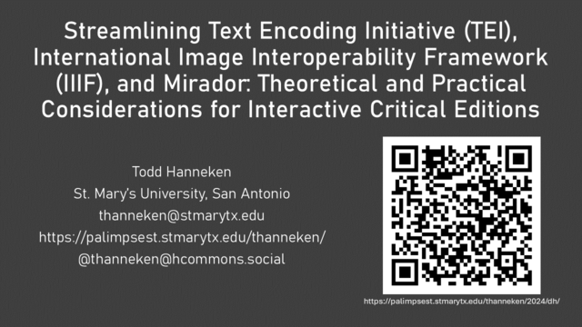 Todd R. Hanneken, “Streamlining Text Encoding Initiative (TEI), International Image Interoperability Framework (IIIF), and Mirador: Theoretical and Practical Considerations for Interactive Critical Editions.” Jubilees Palimpsest Project. San Antonio, Texas: St. Mary’s University, 2024.